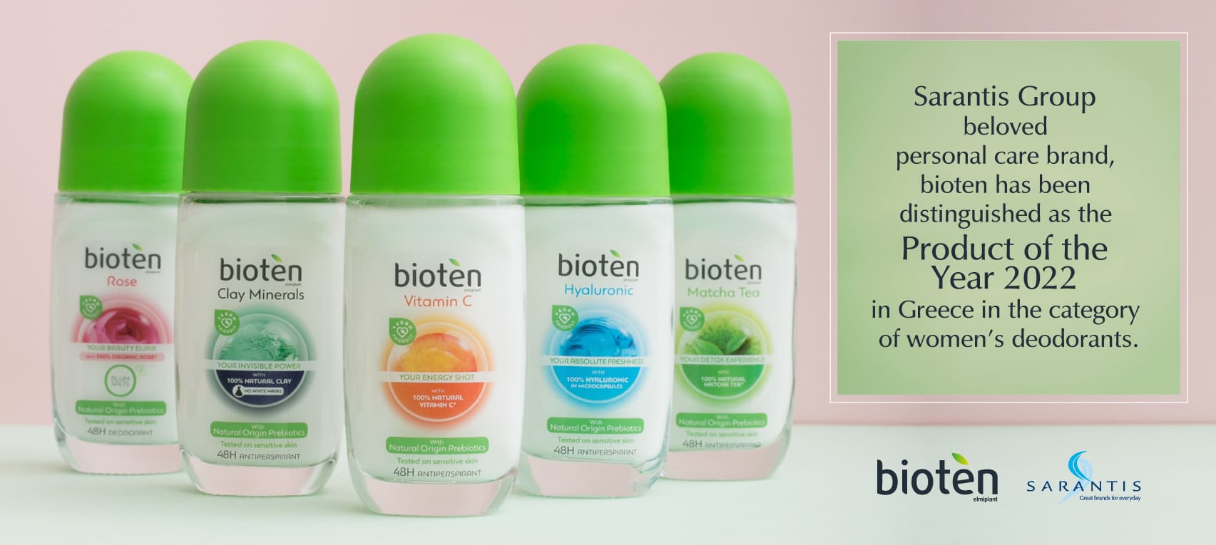 Sarantis Group is recognized one more time for its devotion to innovation and its commitment to high product quality Sarantis Group personal care brand, bioten, with its deep knowledge of natural ingredients and their properties, was awarded as the Product of the Year 2022 in the category of women's deodorants.