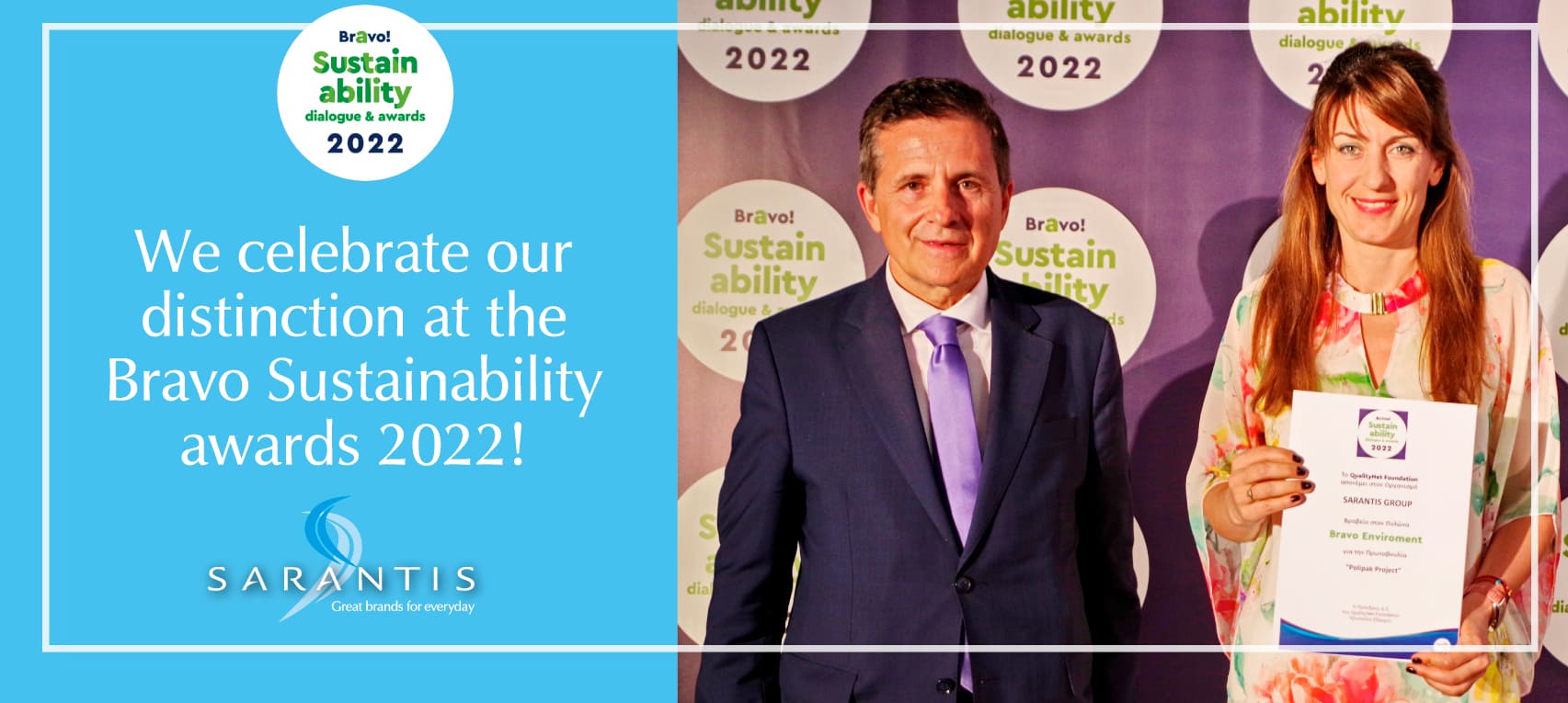 Sarantis Group, one of the largest multinational consumer products companies with a significant international presence, with leading brands and strategic partnerships, was distinguished at the Bravo Sustainability Awards 2022, in the pillar of "Resource Management, Raw Materials and Environmental Footprint" for its investment in Polipak, a Group’s subsidiary in Poland.